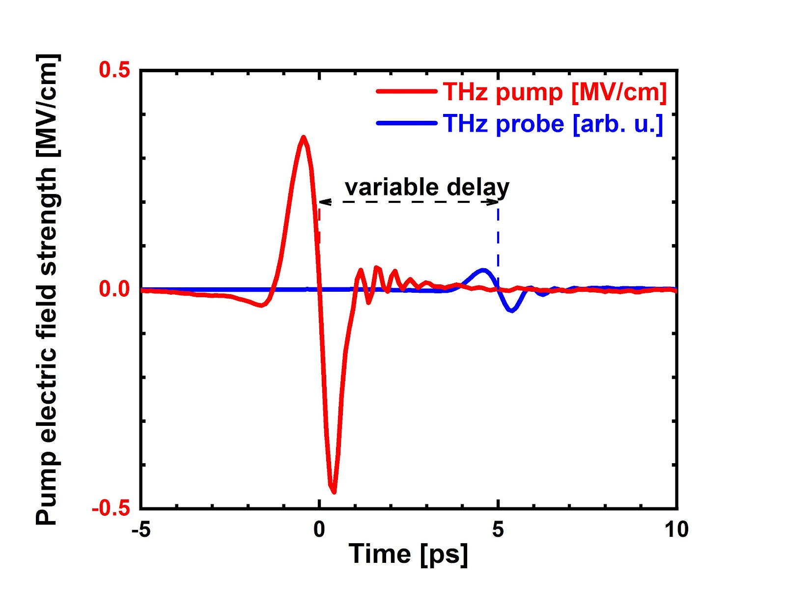 Electric field waveforms of pump and probe THz pulses: electro-optic sampling.