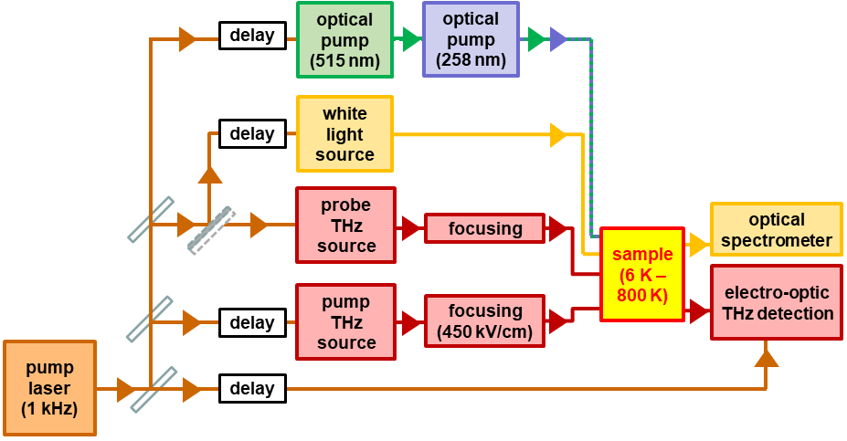 Another part of the optical pump (typically 10–40% of the total energy) generates the THz probe pulses, which propagate through the sample collinearly with the THz pump. The available sample temperature range is from 6 K to 800 K.